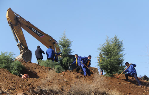 植樹現(xiàn)場,馬達(dá)轟鳴,人聲鼎沸,十多臺挖土機(jī)忙碌著翻土挖坑。部門領(lǐng)導(dǎo)及黨員干部身先士卒,沖在前面,忙得不亦樂乎。廣大員工熱情高漲、干勁十足,或扛或抬、揮鍬培土、踩實壓緊、圍堰澆水,大家分工協(xié)作,配合默契,到處一派熱火朝天的勞動場面,整個過程充滿歡聲笑語。